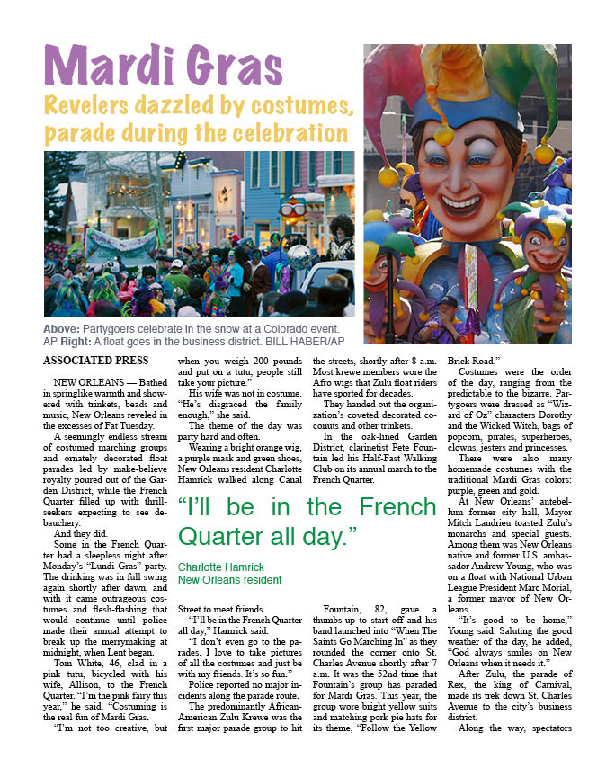 Our assignment involved creating two facing magazine pages. Our subject was Mardi Gras 2012. Using wire photos and an Associated Press recap of the event, we put together our pages. I decided to use the purple, yellow and green that symbolize Mardi Gras in my display type. Next, I tried to play up the great, eye-catching pictures the wire provided.