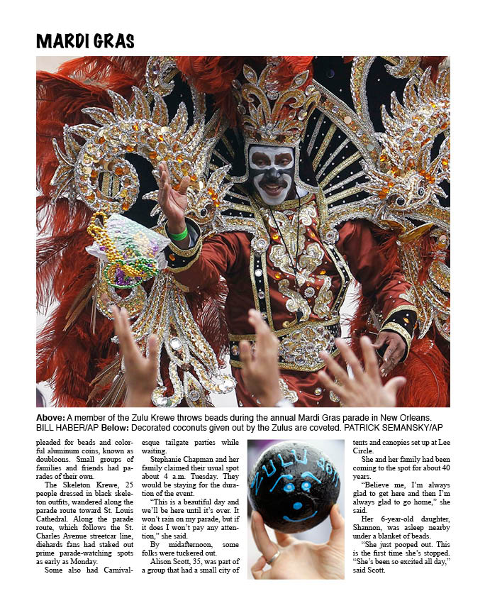 For my second page, I decided to play the best Mardi Gras picture huge and get out of the way. I didn’t want to leave the block of text underneath as one dense whole, so I searched the wires for a photo of the Zulu coconut the story talks about. Sure enough, they had a file photo of the coconut from 2011. I grabbed that, cropped, dropped it on the page and voila, I was done.
